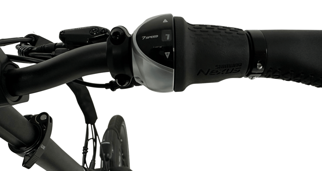 Uitgerust met hydraulische Tektro schijfremmen, 7-speed Shimano naafversnelling, voorvork met vering, en een volledig LCD-display voor superieure controle en comfort.